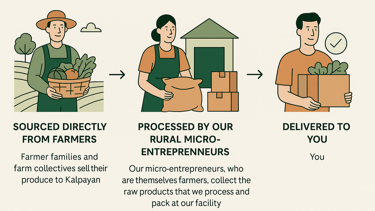 At Kalpayan, we don’t just sell products — we nurture a supply chain that is transparent, ethical, and rooted in purpose. Every item you receive carries the work of farmer-entrepreneurs and the care of our local producers.